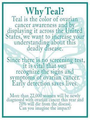 We have teal ribbons all over my home city of Statesville this week to draw attention to this disease that is so difficult to catch in the early stages. Two ribbons are in memory of my friend Mary, whose life and death changed who I was and who I want to be. One of them is in honor of my niece Sara, who survives and gets to mother her three children and create new dreams for herself. The 4th is in my own name, because I wanted to publicly say I’m on the team to fight this disease, and to educate women…and men….so together we can find better and quicker ways to diagnose and treat it.