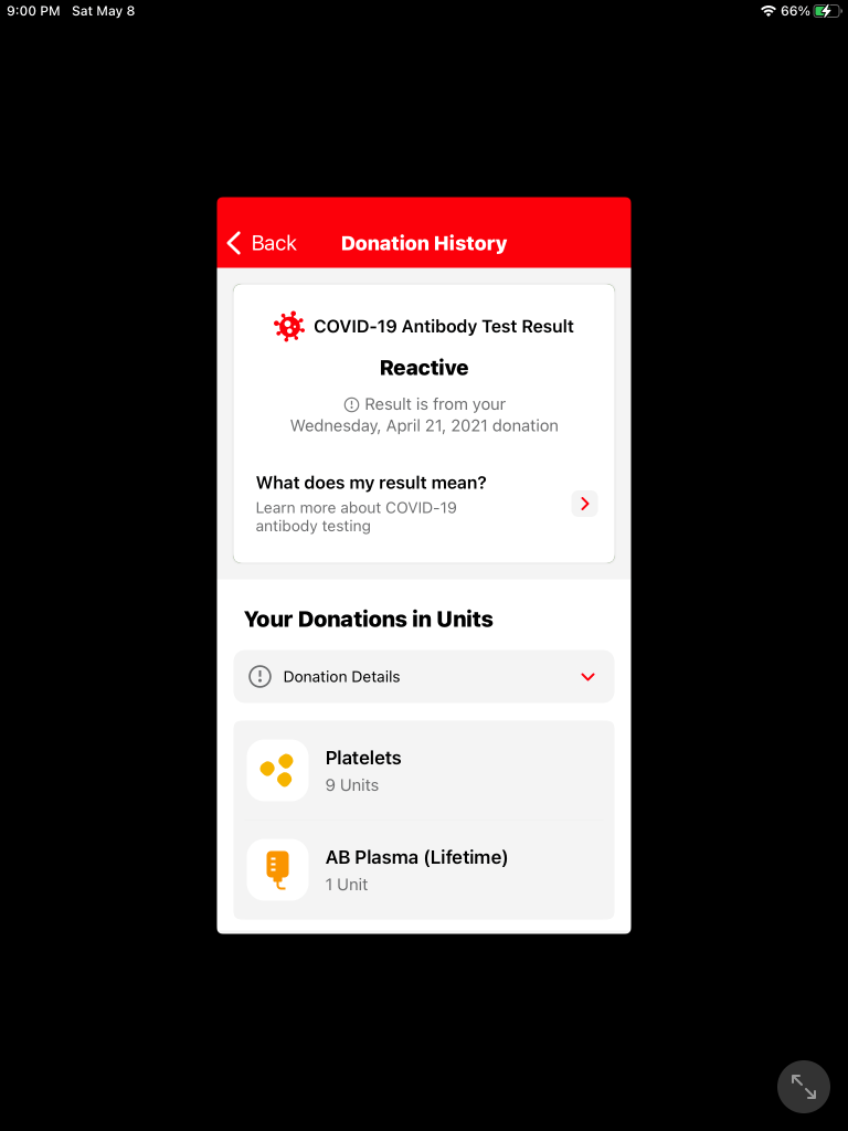 I gave platelets again on April 21. My second COVID vaccination was April 23. That one came back reactive for antibodies. Yippee!