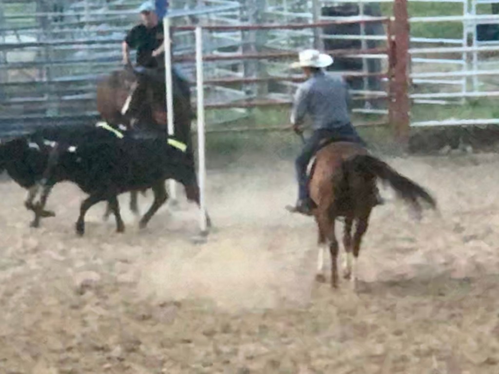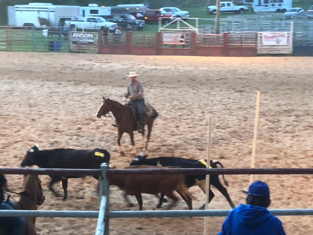 It was. There were six teams of three. They were on horseback. A group of cattle were put in a pen. The team was given three numbers. They had to find the cows wearing those numbers and try to keep the other cows in the open pen. Often cows that weren’t “theirs” would have to be taken back to the open corral. When just their three cows were out, they had to put them through one gate on each side of the arena, then put them in another pen at the other end of arena. Once they did that their time stopped.