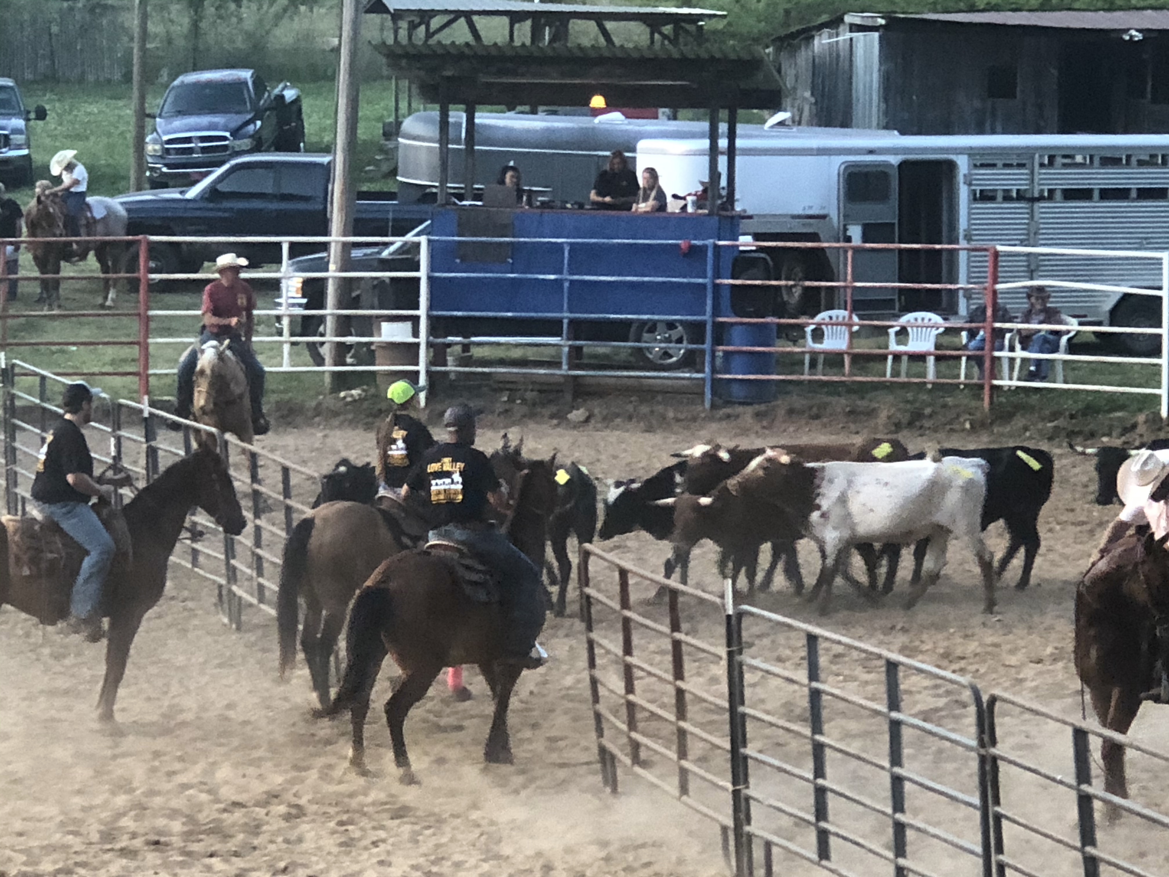 It was. There were six teams of three. They were on horseback. A group of cattle were put in a pen. The team was given three numbers. They had to find the cows wearing those numbers and try to keep the other cows in the open pen. Often cows that weren’t “theirs” would have to be taken back to the open corral. When just their three cows were out, they had to put them through one gate on each side of the arena, then put them in another pen at the other end of arena. Once they did that their time stopped.
