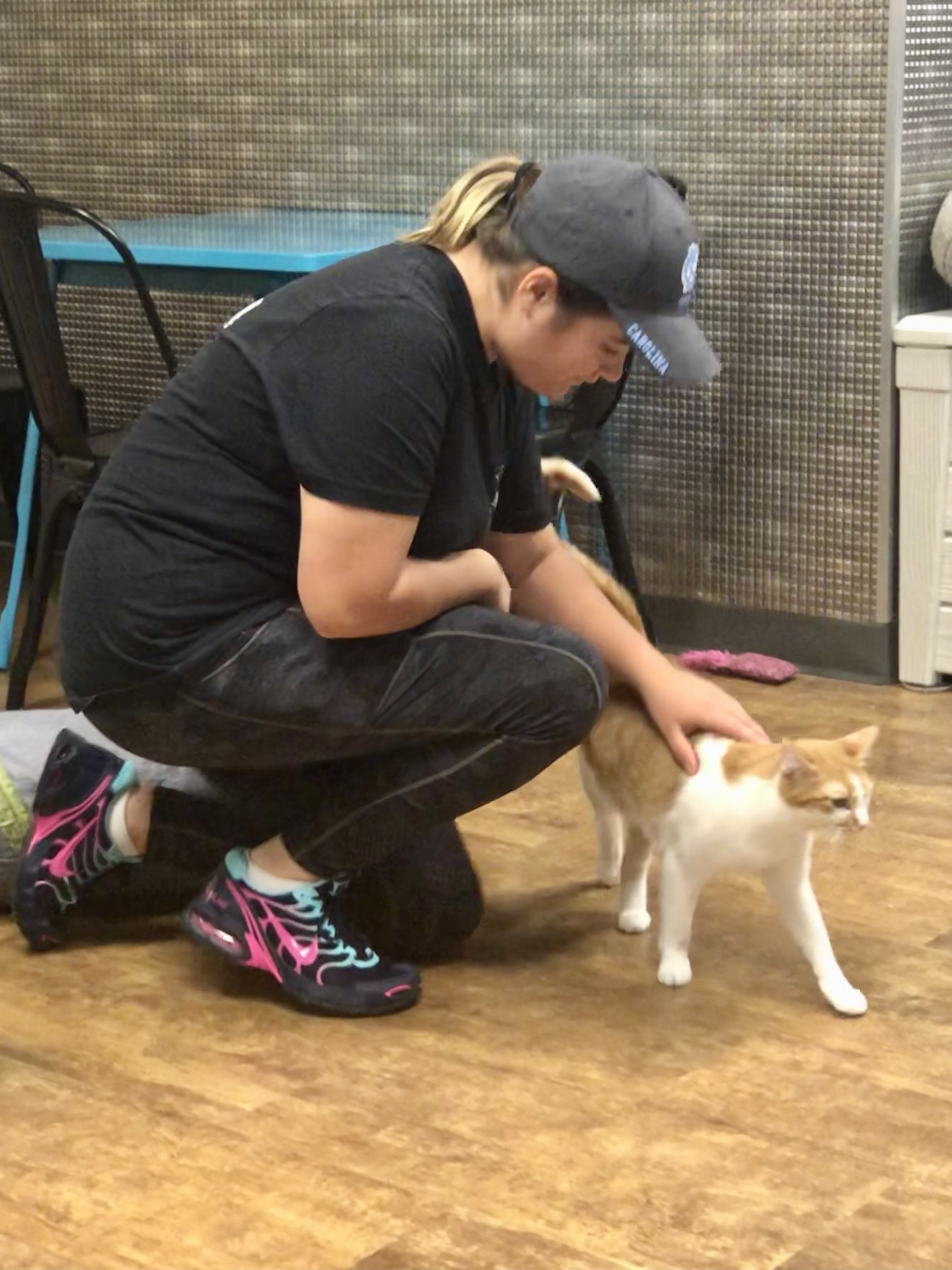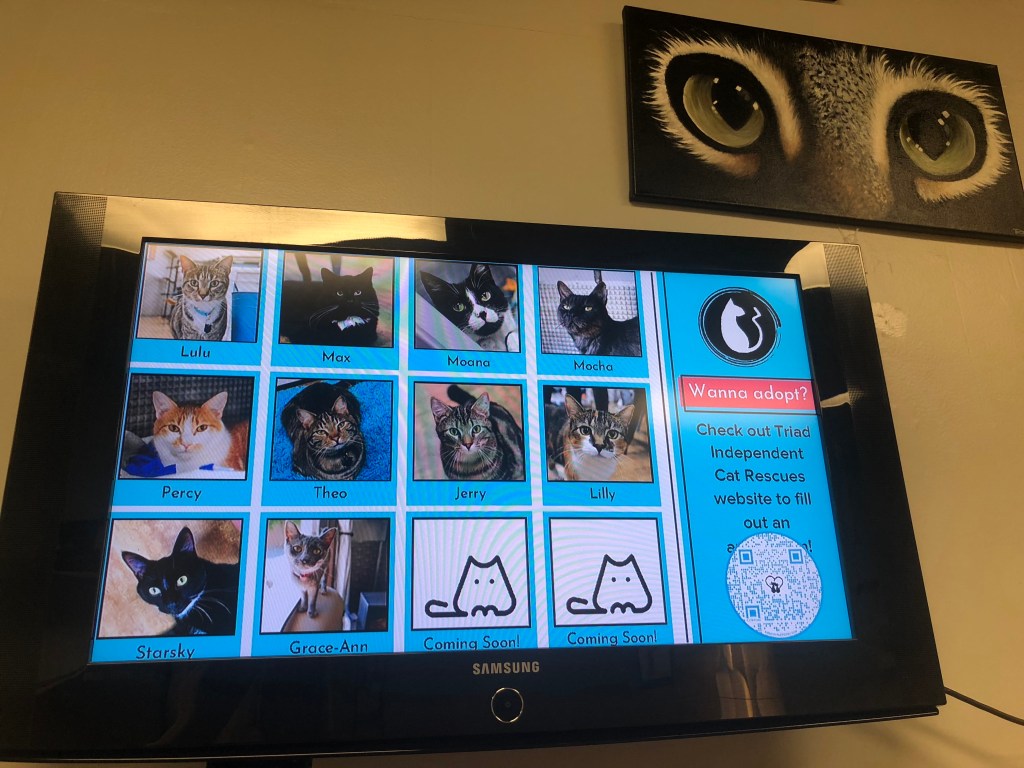 It’s a great concept. This is actually a nonprofit cat rescue that houses 12 adoptable cats, working in concert with another local rescue organization that gives them the cats and handles the adoption process. People like us come in and pay to play with them. Some folks come not just to play, but to see which cat, or cats, they want to adopt.