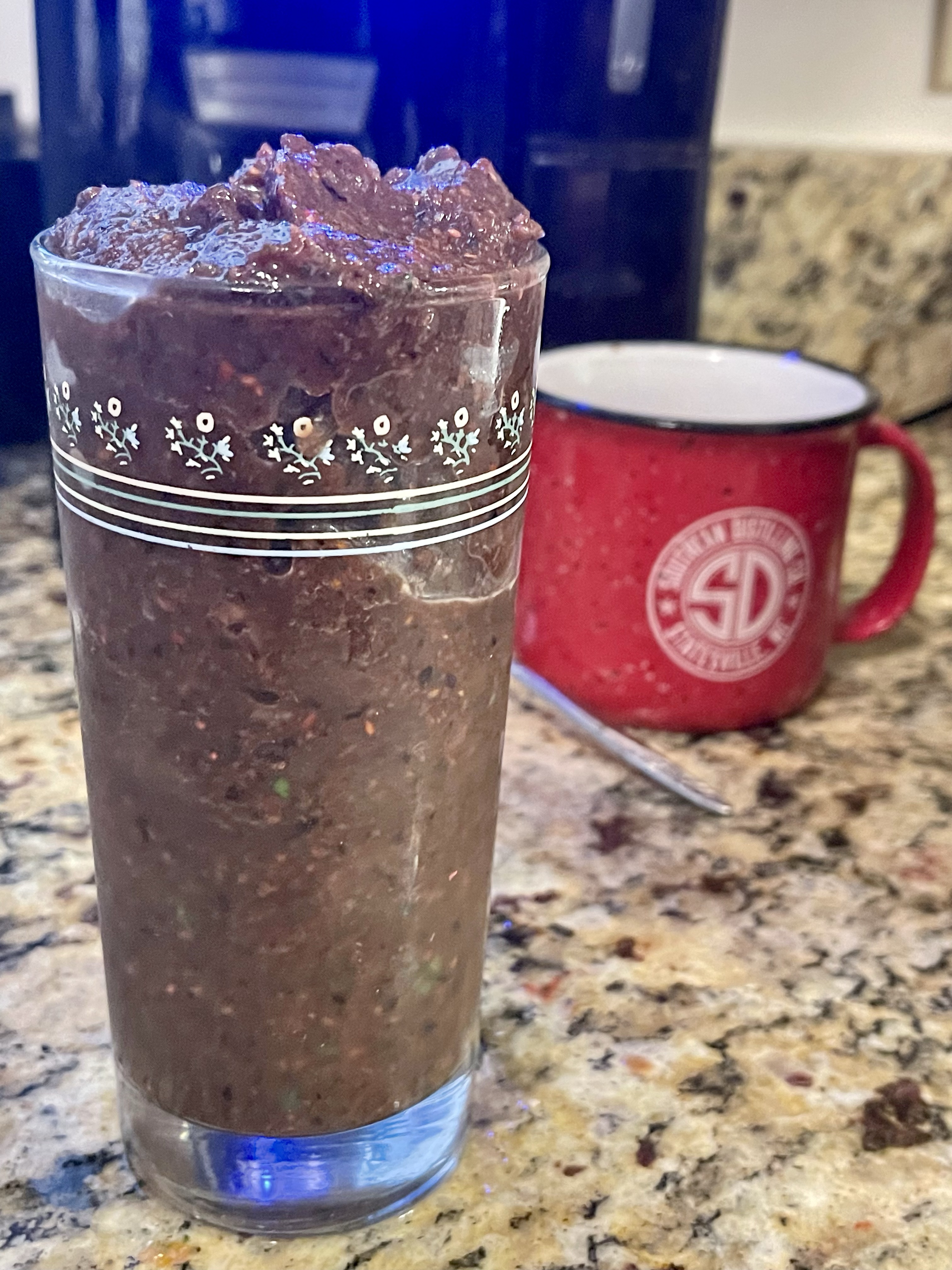 This morning I also used carrots, one mandolin, a bit of frozen mango, and frozen mixed berries. I added water To get it to the consistency I prefer and blended. It was delicious and a great start for the day. I admit it’s a bit ugly but usually it’s prettier! You can add yogurt, milk, protein powder, or juice, but usually I just use water. (By the way. I believe my friend Carole gave me that glass for Christmas in 1983! Two still exist, which us amazing for this klutz.)