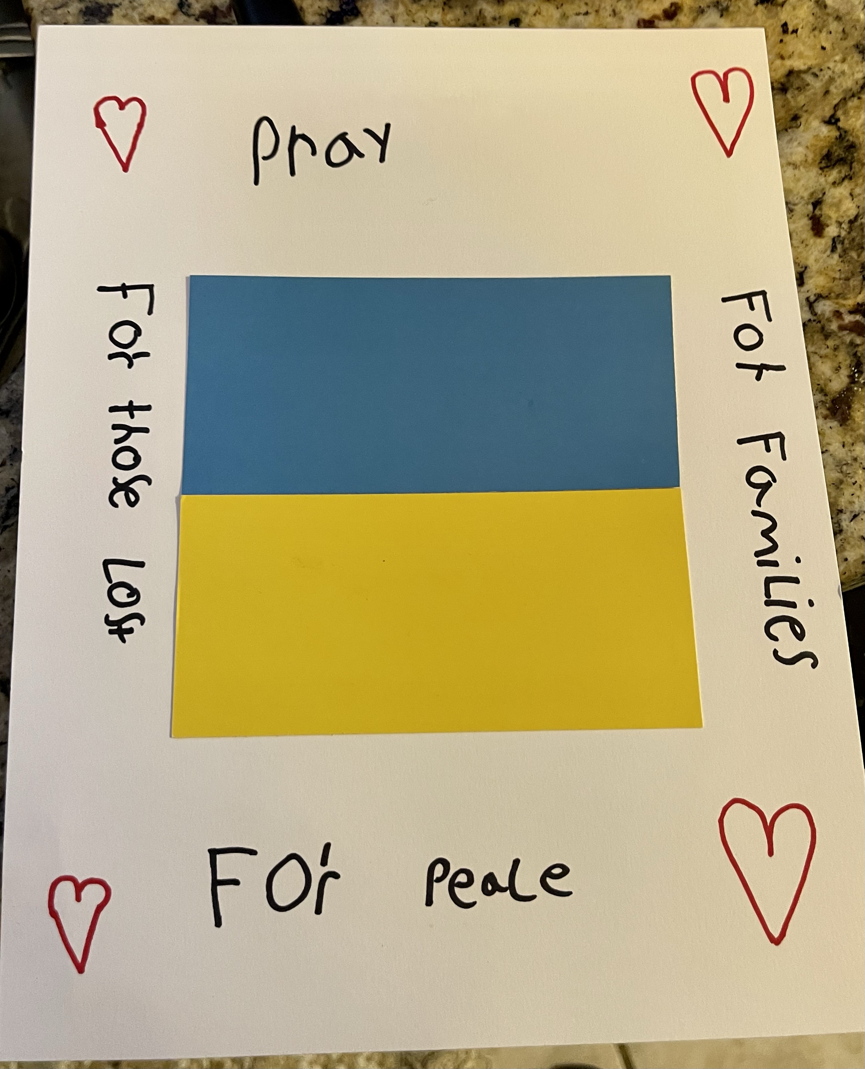 My sign is in the front window of my apartment. A small way I can show I support the people of the Ukraine, given to me by two young girls who are being raised to know we need to pay attention to our world and stand up for its people. Who are encouraging us not to forget these people. Even if no one else sees it, I notice it each time I go home, and I pray. It focuses me to watch God work in this war and not just stay in my own small world.