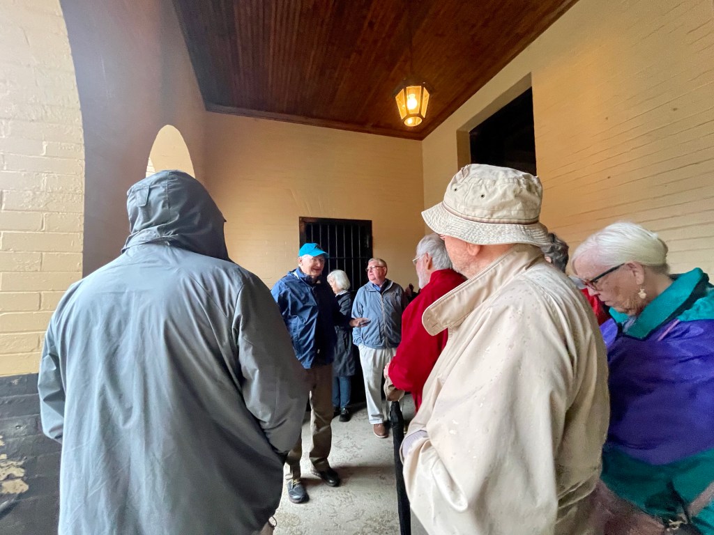Today for Good Friday we gathered at the old jail, our meditation on the old hanging tree. We were supposed to gather underneath it, but the porch of the old jail was a good and appropriate haven from the rain.